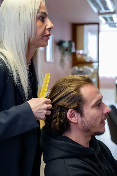 As Daniela moved into the cut, the focus shifted to shape and movement. She worked carefully, refining rather than reshaping, creating softness through subtle adjustments. Watching in the mirror, I could see the logic of each decision — nothing excessive, nothing rushed. When she finished drying my hair, the result felt immediately right. There was brightness without harshness, softness without loss of structure. Running my fingers through it, I noticed how smooth it felt — lighter, healthier, more natural.