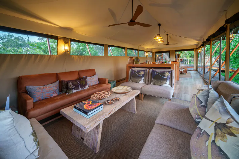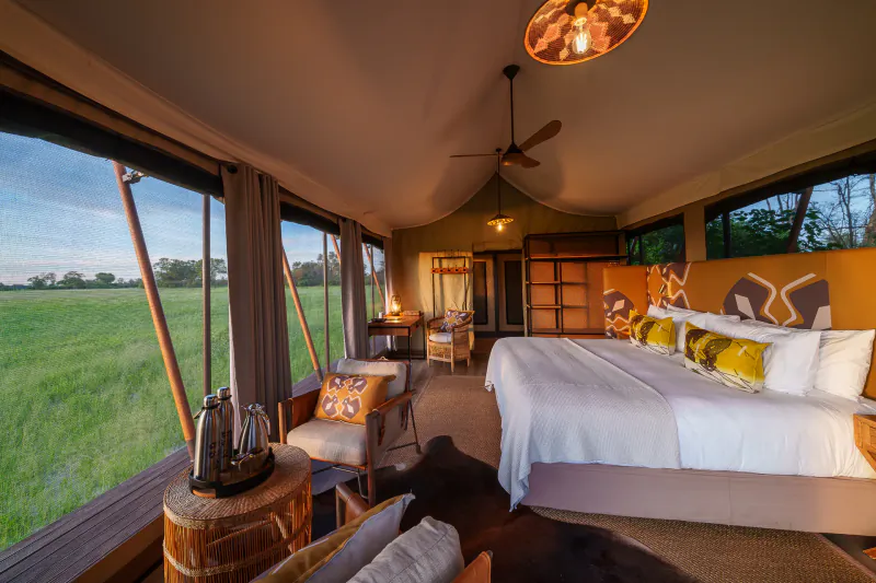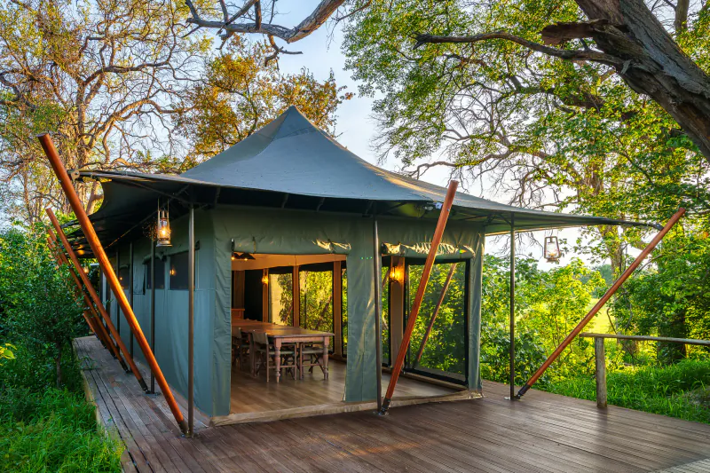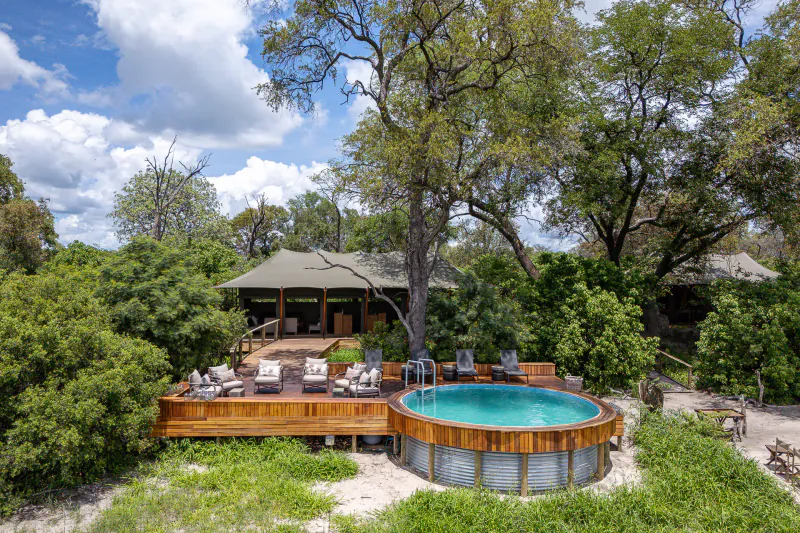 The 8 spacious tents (including a family room) are hidden in a wooded peninsula, shaded by leadwoods and sausage trees, that juts out into an Okavango floodplain and overlooks a well-trodden game path to the water.