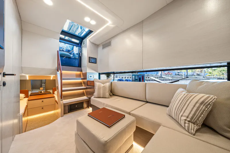 Descending the companionway from the cockpit, you land in a welcoming lounge area with generous 2.2m headroom – styled in neutral, contemporary tones. Comfortable sofas line the hull, and the lounge is bathed in natural light from the full-length hull window. There’s the option of a large, flush-mounted TV, with a coffee nook and a fridge.