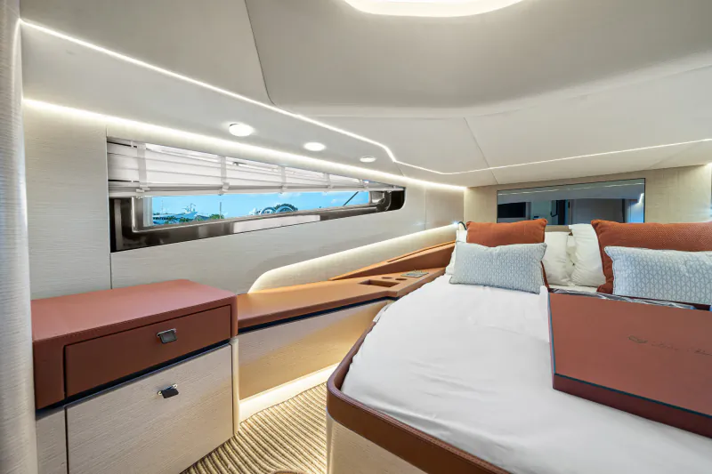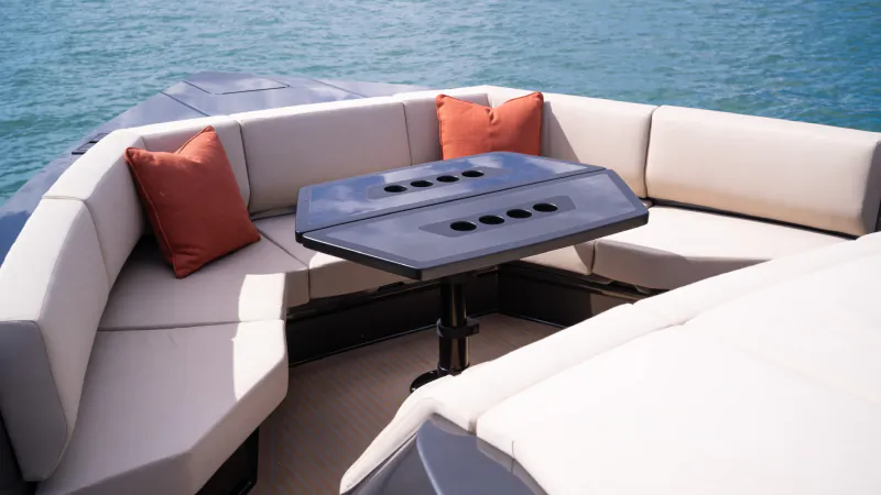 A luxurious three-person sunpad reigns supreme over the aft platform, giving way to elegant seating for six around an oval-shaped table in the welcome shade of the hardtop. Upholstery is in a hard-wearing exterior fabric made specially for Manari. An expansive wet bar, grill and fridge have been subtly integrated into this space, providing everything needed for lively entertaining. Each element is crafted to create a welcoming space where leisure and socialising come naturally.