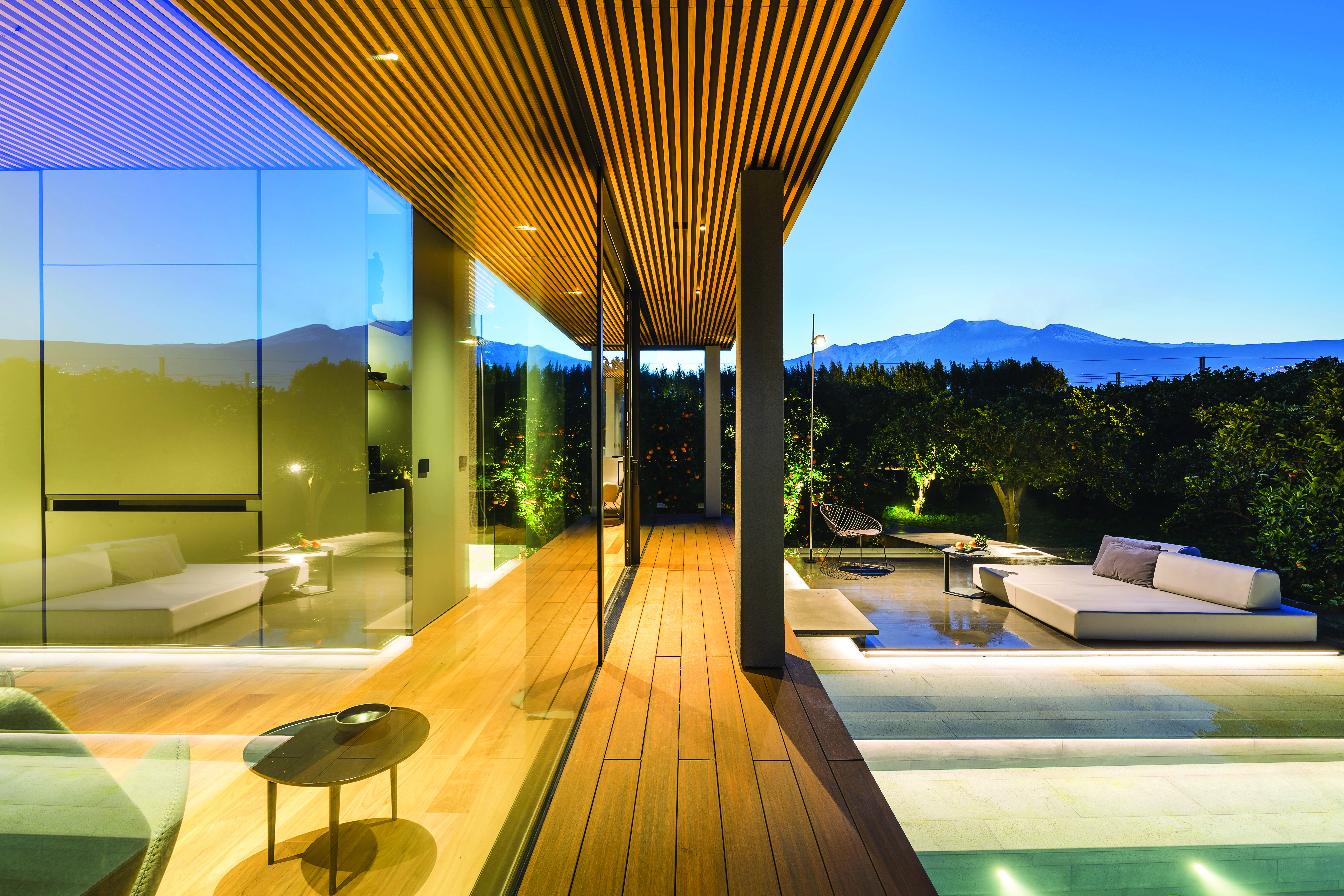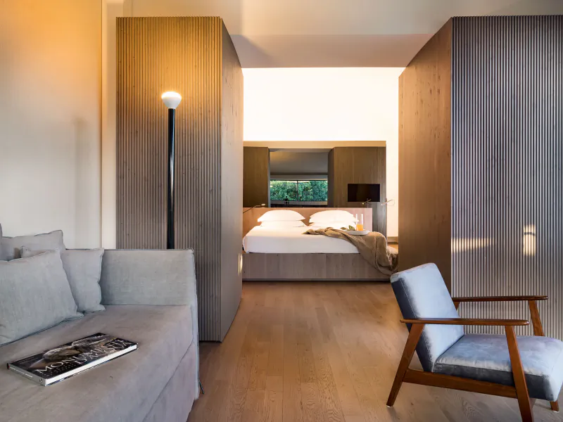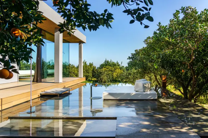 Four rooms and suites are immersed directly in the countryside. Large windows create a continuum with the outdoors, giving the impression that the citrus trees themselves are the walls of the room. These rooms are just a few steps from the pool, playing with the history of rural architecture turned into modern design.